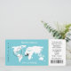 "El amor es un viaje": tarjeta de embarque de la entrada de Novedad con un mapa del mundo, un avión y un corazón giratorio en azul y blanco verde azulado. El lado inverso tiene una plantilla para su foto personal y espacio para más detalles. Se trata de una idea ideal para cualquier boda de destino o para un boda de temas de viaje.