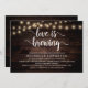 Tarjeta de invitación de Despedida de Soltera con caligrafía moderna (El amor está en el aire), con diseño de luces de cuerda de madera oscura rústica. Invite a los invitados con esta perfecta tarjeta de invitación. Agregue los detalles de su Despedida de Soltera con la redacción correspondiente.