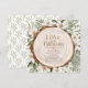 Esta elegante invitación a la ducha de novias "el amor está en flor" cuenta con un trozo de madera rodeado de flores blancas y hojas verdes. En el reverso, un fondo blanco con motivos florales. Personalízalo para tus necesidades. Puedes encontrar productos coincidentes en mi tienda.