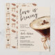Celebra a la futura novia con una moda "El amor se está preparando" espresso martini invitación a la ducha de novia. Con un diseño lúdico y elegante, esta invitación marca el tono para una reunión sofisticada llena de cócteles divertidos y deliciosos. El elegante espresso martini, complementado con la tipografía moderna, crea un ambiente moderno y acogedor, perfecto para una celebración animada. Ideal para las novias amantes de los cócteles, esta invitación promete una ducha memorable, una mezcla de amor, amistad y un toque de elegancia con un toque refrescante.
