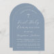 Una simple y moderna invitación en forma de arco a la primera comunión. Sólo tiene texto blanco sobre fondo azul polvoriento. En la parte superior hay una cruz con texto en arco encima de ella. La ocasión y el nombre están escritos en guión.
