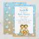 Cuidada acuarela azul bebé ducha de color Twins invitaciones temáticas para mellizos con fondo estelar. Pequeños gemelos de acuarela vestidos de azul rodeados de osos de peluche. Gradiente azul y marrón.