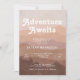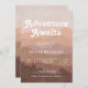 Una invitación a la moda para una ducha de bebé boho con montañas rosas y fondo de bosque, cubierta con un tipo de letra retro blanco y el titular editable "Adventure Await"