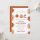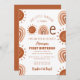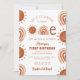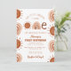 Una moderna y rústica invitación al boho de la tierra por primera cumpleaños con arcoiris color tierra terracota y elementos de sol.