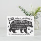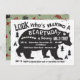Super divertido boho tribal. Invitación de cumpleaños del oso con oso negro grande, pino, flechas y títeres con fuentes divertidas y un fondo salpicado. En la parte trasera hay huellas de flecha y de pie de garra de oso. Ilustracion dibujado a mano por McBooboos