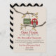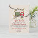 A de nuevo a la invitación de la casa abierta de la sala de clase de la escuela que ofrece un ilustracion de un búho rojo con un vientre blanco y negro del galón que se sienta en una rama de árbol con la pizarra. Personalice el texto. El lado opuesto es galón negro.