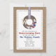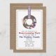 Una invitación a una fiesta para el ama de casa con un ilustracion de una corona monogramada con un esquema de color rojo blanco y azul. La corona tiene rosettes y está colgando de la cinta de chevron. El fondo está inspirado en la burlona. Personaliza la corona con la carta de tu primera. Personalice el texto con detalles de su ocasión.