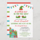 Navidades caprichosos inspiraron una invitación a la ducha de bebé con un gorra elfo y zapatos elf enmarcando "¡un pequeño elfo está en camino!" con luces de Navidades coloridas y un montón de regalos, todo en un estilo retro extravagante de los años 50 con líneas maravillosas y colores simples de rojo, verde y azul. Un pequeño elfo está en camino para una ducha de bebé, por invitación de los Navidades, para una ducha de bebé con motivos propios.