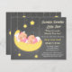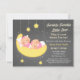 ¡Centelleo del centelleo poca estrella, un qué milagro precioso usted es! ¡El milagro doble con esta invitación gemela linda de la fiesta de bienvenida al bebé de los chicas! ¡En la luna creciente son dos niñas durmientes lindas en rosa dulce! Uno está descansando sobre una almohada mientras que los otros restos en el primer vago. ¡Cómo es dulce! El chispear y el brillar atado encima de las estrellas brillan maravillosamente a través del fondo gris que pone en contraste mientras que los bebés soñan lejos. Personalice fácilmente con sus detalles del fiesta. ¡Grande para que mamáes sean quién están contando con a chicas gemelos!