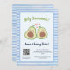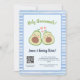 La invitación a Baby Shower del código QR neutro de género de aguacate lindo es una manera divertida y lúdica de invitar a sus seres queridos a celebrar su próxima llegada. Con un par de aguacate lindo con fondo de banda azul. Con mucho espacio para incluir todos los detalles importantes además de la opción de escanear código QR, esta invitación es perfecta para una ducha de bebé con temática espacial o para cualquier persona que busque una invitación única y memorable.