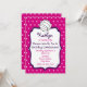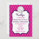 Invitación de la fiesta del cumpleaños de un chica que ofrece un fondo rosado con los lunares blancos en frente y la parte posterior. El frente ofrece el marco púrpura brillante con la escritura púrpura y rosada. Ilustracion del voleibol en la parte superior.