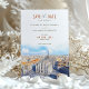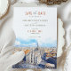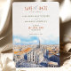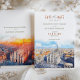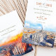 Esta cautivadora tarjeta de última generación cuenta con una impresionante representación acuática del Duomo di Milano y el paisaje urbano circundante, bañados por el cálido resplandor de una puesta de sol. Las obras de arte muestran vivos tonos de naranja feroz, rojo intenso y tonos azules contrastantes, lo que crea una impresionante representación del horizonte de Milán. Los ricos colores y los detalles le dan un toque romántico y artístico, perfecto para una boda de destino en Italia. La elegante tipografía, en tonos tierra, complementa el vibrante ilustracion, por lo que esta tarjeta es ideal para las parejas que planean un boda en Milán o que buscan evocar el encanto de la arquitectura italiana. Con su mezcla de elegancia tradicional y arte acuático moderno, este salón-the-date prepara el escenario para una celebración inolvidable.