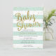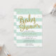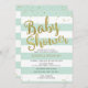 Estas invitaciones adorablemente de moda de la fiesta de bienvenida al bebé ofrecen rayas modernas de la verde menta y del blanco con falso confeti del efecto metalizado de oro. El texto de "Baby Shower" también se hace en un falso estilo bonito del efecto metalizado de oro. ¡Dulce perfectamente moderno y estupendo! Los amigos y la familia amarán la elegancia simple, moderna de esta tarjeta. Parece especialmente de lujo con "forma del soporte" y las opciones del papel "del reflejo de lujo de la perla". Vea mi tienda para los artículos de coordinación (y éntreme en contacto con si usted necesita el algo más creado para coordinar!) ©2016 Weddings*n*Whimsy