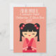 Una invitación para una fiesta de temática japonesa hecha en el fiesta de sushi de Japón. El ilustracion estilo arte de las muñecas kokeshi tradicionales es colorido y el color de fondo y el texto pueden ser cambiados a tu gusto.