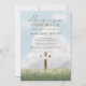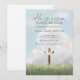 Esta invitación de desayuno Pascual cristiano muestra un fondo de cielo pacífico con una ilustración de cruz y el mensaje “Él ha resucitado”.