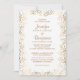 Invitación a una boda rústica, dorada y blanca, con flores de aliento para el bebé.