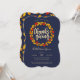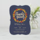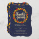 Invite a su familia y amigos a su fiesta del día de Acción de Gracias con este diseño de hojas de otoño. Esta tarjeta presenta un Día de Acción de Gracias en el centro de una corona de hojas de color ocaso sobre un fondo marino. En la parte posterior de esta tarjeta, se muestra un patrón de hojas amarillas, naranjas y rojas.