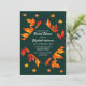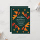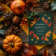 Diseño rústico y moderno con hojas de otoño en tonos rojos, naranjas y amarillos en un fondo verde oscuro de temporada