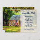 Esta invitación Save the Date boda cuenta con un granero rústico con una bandera patriótica estadounidense y la palabra "amor" en un encantador entorno arbolado.