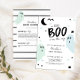 ¡Un Baby Shower de Halloween no tan espeluznante! El color azul y verde pastel, A Little Boo está en camino a Baby Shower de Halloween con un diseño especial de espalda que incluye Diaper Raffle y Books for Baby sobre un fondo de rayas blancas y negras.