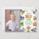 Esta encantadora invitación a la fiesta de cumpleaños número 1 presenta una foto vertical y se acentúa con un adorable borde animal de la jungla. El texto inteligente dice: (Nombre) es salvaje. Los animales incluyen: leopardo, cebra, rinocerontes, tigre, cocodrilo, león, jirafa, elefante y cerdo salvaje.
