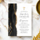 El borde izquierdo de esta elegante y moderna invitación a la primera comunión cuenta con un borde de batida de color negro adornado con un falso purpurina de oro. Una falsa cruz de Relieve metalizado dorado aparece encima del texto del personalizable, que combina escritura a mano, copperplate y tipografías cursivas en gris carbón sobre un fondo blanco. El reverso presenta un diseño de agate negro y oro a juego.