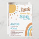 El estilo retro de la invitación al primer cumpleaños del domingo viene aquí la invitación de cumpleaños del sol con un encabezado de fuente de estilo retro, sol, arcoiris y la foto de atrás de tu niño. La invitación de este niño para el primer cumpleaños es ideal para alguien que busca una invitación de primer cumpleaños de estilo retro para un niño.