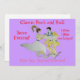los pares de los bailarines A del rock-and-roll de los años 60 de los años 50 de la invitación de la danza del rock-and-roll de los bailarines del rock-and-roll de los años 60 de los años 50 de rock-and-roll o jive a bailarines. Un chica que lleva una falda del caniche, calcetines del bobby, zapatos de silla de montar una camiseta amarilla y pañuelo para el cuello y cinta en su cola de potro. Un muchacho del peluche con una chaqueta amarilla del lazo azul del estrecho del corte de pelo de DA con el cuello azul y el ajuste, pantalones amarillos