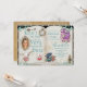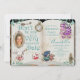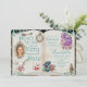Esta caprichosa y encantadora invitación a la fiesta incluye un tema de un libro de cuentos de historias de Alice in Wonderland. El fondo presenta un libro abierto sentado encima de un patrón de arlequín en verde azulado y negro. Varias imágenes de colores con acentos purpurinas de oro de la historia de Alicia en el País de las Maravillas se colocan a lo largo de los bordes del libro. El gato de Cheshire está sentado en la parte superior derecha con una botella que dice "bebe". El conejo blanco está situado en la parte inferior izquierda y el gorra de Mad Hatter está situado cerca del centro inferior junto con una pila de tatuajes. A la izquierda hay un espejo dorado brillante donde puedes añadir tu propia foto.
