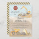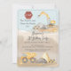 Creado con una acuarela silenciosa menos tradicional, este diseño de tercer cumpleaños Fiesta incluye un camión de volquete y una excavadora de fondo en un sitio de construcción con el título "Detengan el tráfico y cierren las carreteras para" el cumpleaños de su hijo. El palet silenciado se continúa en la parte posterior con un patrón de rayas diagonales gris y amarillo más suave. Diseño compuesto por Holiday Hearts Designs (derechos reservados).