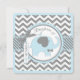 Moda de color gris y blanco con acentos azul bebé y aspecto polka punto arco de aspecto 3D y guarnecido de cinta de rayas y elefante azul con corbata de arco invitación a un bebé.