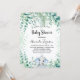 Para una ducha de bebé, celebrando a un bebé. Un fondo blanco, un niño pequeño y adorable elefante y vegetación de eucalipto y chispas verdes. Personalice y agregue el nombre del nombre de la futura madre y los detalles del fiesta. El nombre y el texto: Baby Shower se escriben con un guión de estilo con letras a mano