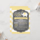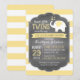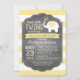 Fondo de impresión de rayas amarillas y blancas con elefante blanco que sopla corazones mellizos tarjeta de invitación a la ducha bebé.