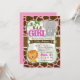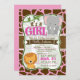 It's a Girl! Cute bebé elefante y león, jungla, safari, zoo tema animal chica de ducha de bebé invitación sobre el patrón de impresión de jirafa rosa pastel y marrón con vid verde, hojas. Ideal para las duchas de bebés con temática de jungla, zoológico o safari. Invitación en forma de soporte de época. Los colores son rosa pastel, marrón, verde, gris y blanco.