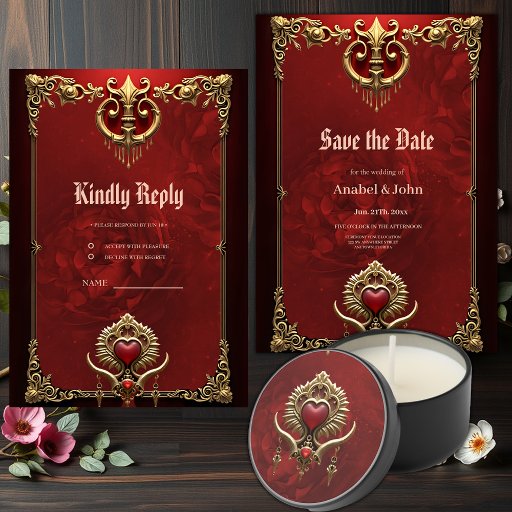 Invitación Elegancia en rojo luster con un corazón ornamentad