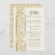 Preciosa invitación dorada y blanca para el quincuagésimo aniversario de boda con un sutil fondo de franja vertical blanca en la parte frontal de la invitación y un panel lateral de encaje floral dorado elegante y detallado. La parte posterior de la tarjeta tiene un patrón de encaje dorado a juego sobre blanco. Personalice la parte frontal de la invitación con su información. La tarjeta también está disponible en versión rectangular en mi tienda.
