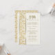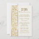 Elegante invitación dorada y blanca para el quincuagésimo aniversario de bodas con sutil franja vertical blanca en el frente de la invitación y un panel lateral de encaje floral dorado elegante y detallado. La parte posterior de la tarjeta tiene un patrón de encaje dorado a juego sobre blanco. Personalice el frente de la invitación con su información. La tarjeta también está disponible en versión rectangular en mi tienda.