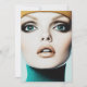 Un retrato de primer plano sorprendente de un modelo con ojos verde azulados cautivadores, acentuados por el diseño atrevido de los ojos, y labios llenos de tonificación neutra. El estilo vintage y los ricos colores evocan la esencia de la moda de los años 60, con un toque de arte moderno. Su intensa mirada y su suave expresión capturan el encanto y la sofisticación de la era.
