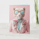 Un elegante leopardo blanco vestido con un traje rosa extravagante adornado con joyas, detalles florales y elegantes adornos. Los brillantes gafas de sol redondas de los deportes felinos y una bowtie pastelera, con una sofisticación y un glamour exuberantes.
