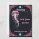 El diseño de esta encantadora invitación a la boda presenta un tema subacuático etéreo. El punto focal es una lujosa medusa rosa y translúcida que flota con gracia en un fondo profundo y oscuro, evocando un ambiente místico y sereno. La decoración, intrincada y de estilo coralino, florece en un marco suave rosa y verde azulado, dando un sentido de elegancia y capricho. En la parte superior e inferior, unos motivos circulares ornamentales que se asemejan a las flores de color aportan un toque de encanto celeste que se completa con la paleta oceánica. El diseño general transmite una vibra de ensueño, de otro mundo, perfecta para una celebración romántica y única de los bodas.