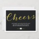 Esta magnífica invitación a la fiesta de Nochevieja incluye la palabra "Cheers", escrita con letras de caligrafía dorada sobre un fondo negro.