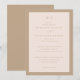 This elegant wedding invitation features a soft beige background with a minimalist layout that emphasizes clean lines and balanced spacing. The design utilizes a mix of serif and script fonts to create a sophisticated and formal look, perfect for a timeless celebration. With its muted color palette and understated aesthetic, the invitation conveys grace and simplicity, making it ideal for couples seeking a refined touch for their special day. The absence of decorative motifs ensures that the focus remains on the important details, while the customizable text allows for personalization without distractions.