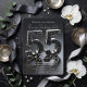 Set the tone for an unforgettable evening with this sophisticated 55th birthday dinvitation. This luxury aesthetic features oversized, 3D-rendered "55" typography designed with a stunning black faux glitter texture and encased in a sleek silver chrome border. The numbers pop against a dramatic matte black background, creating a moody, high-end vibe perfect for evening soirees, black-tie events, or elegant dinner parties. The guest of honor’s name is written in a chic, modern white script, adding a personal touch of elegance. This design perfectly balances modern glitz with timeless sophistication, ensuring your milestone celebration starts with a statement.
