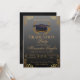 A sophisticated graduation invitation design featuring a luxurious black background with elegant gold decorative elements and a graduation cap surrounded by golden laurels. This stylish and modern card is perfect for celebrating a special academic achievement and inviting friends and family to share the joy of graduation day. Ideal for formal graduation parties and memorable celebrations.