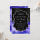 This sophisticated design features a rich blue agate crystal pattern layered with black and silver accents for a refined, modern look. The natural stone texture creates organic movement and depth, while shimmering details add a touch of luxury and elegance. Paired with an ornate frame and classic typography, this design balances contemporary glamour with timeless wedding style. Ideal for chic, upscale weddings, it evokes confidence, beauty, and polished sophistication.