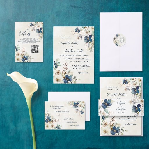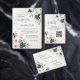 A sophisticated invitation for your winter wedding with elegant navy blue and soft turquoise watercolor flowers with winter greenery and modern handwritten style text.