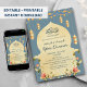Celebrate the joy of the holy month with this vibrant and elegant Iftar Dinner invitation. This design features a glowing parchment-style arch set against a dusty blue background, adorned with hanging golden lanterns and delicate floral garlands.