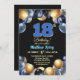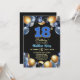An elegant modern design featuring blue 18 number with gold edges and balloons with silver, blue and gold glitter. Customize the details for a unique and chic Birthday Celebration.