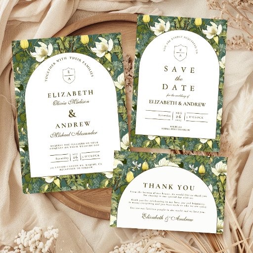 A sophisticated botanical design featuring rich green foliage and soft ivory blooms, framed within a timeless arched layout. The deep, nature-inspired tones bring a sense of depth and refinement, while the clean typography keeps the overall look elevated and effortless.