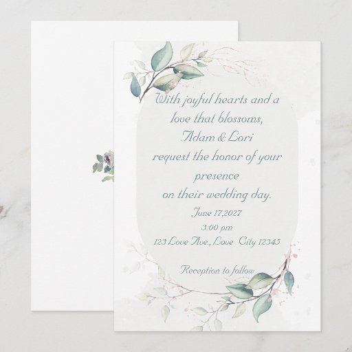 Elegant Botanical Love Wedding Invitation featuring soft watercolor greenery and delicate floral accents. Perfect for boho, romantic, and nature-inspired weddings. Fully customizable for your special day.